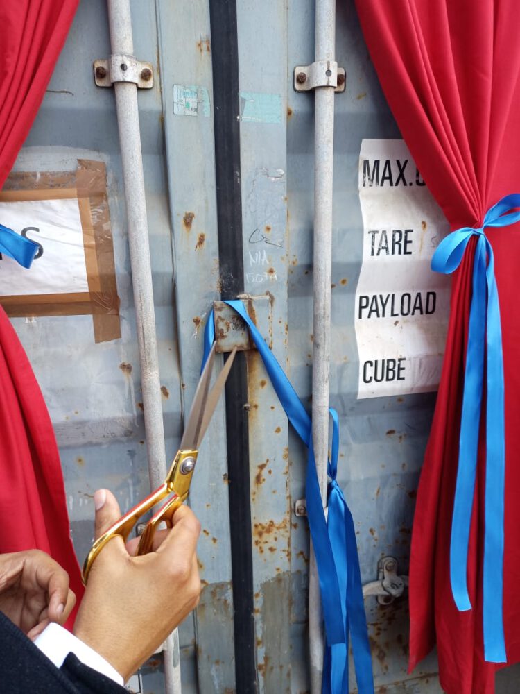 Die Feier begann mit fröhlichem Gesang und einem Dankgebet, bevor schließlich das Band zur Öffnung des Containers feierlich durchschnitten wurde.